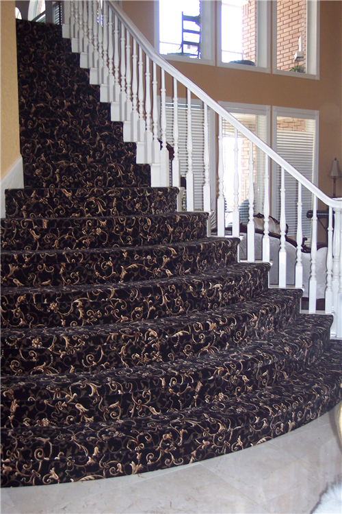Woven Patterned Carpet on Stairs. They are curved and bow out like a wedding cake. -